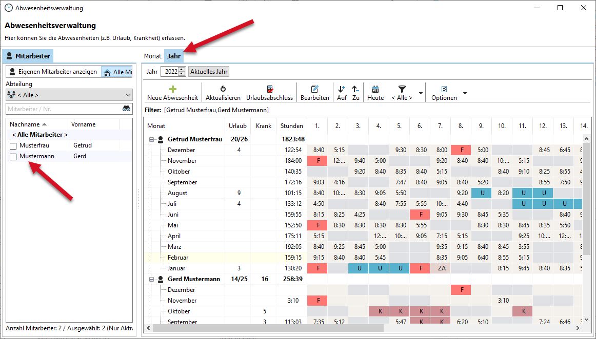In der Abwesenheitsverwaltung haben Sie den Bereich der Mitarbeiter, in dem Sie die Abwesenheiten einzelner oder aller Mitarbeiter anzeigen lassen können.