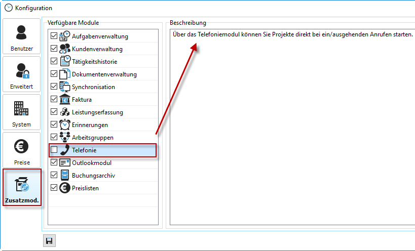 Haben Sie das Telefoniemodul gekauft, ist dieses in Ihrer Lizenzdatei beinhaltet. Nachdem Sie Ihre Lizenzdatei aktiviert haben, aktivieren Sie das Telefoniemodul in Ihrem Xpert-Timer. Dazu öffnen Sie die Konfiguration und wählen den Bereich "Zusatzmodule". Setzen Sie einen Haken beim Zusatzmodul "Telefonie".