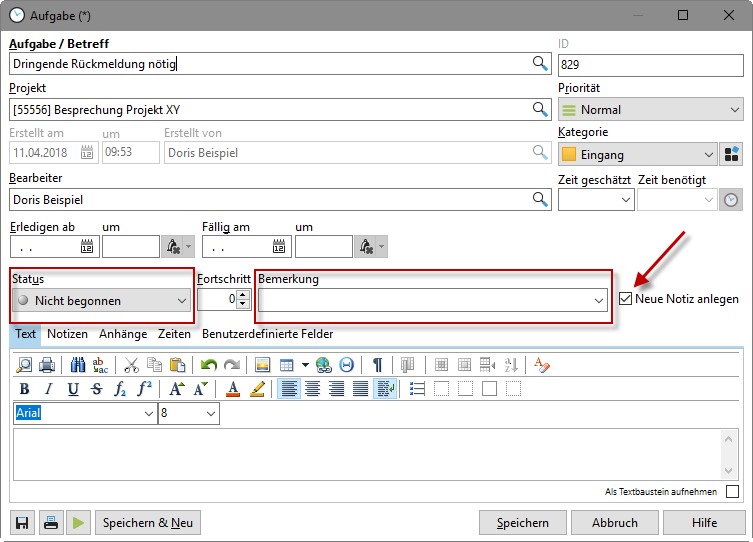 Die Aufgabe wird erstellt und einem Mitarbeiter zugewiesen. Im Beispiel hat "Doris Beispiel" die Aufgabe erhalten. Sie befindet sich zu Beginn im Status "Nicht begonnen". Der Haken bei "Neue Notiz anlegen" ist gesetzt, um Änderungen des "Status" und des Felds "Bemerkung" zu dokumentieren.