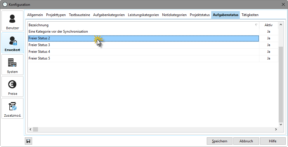 In der Konfiguration des Xpert-Timer können Sie fünf freie Status vergeben. Benennen Sie den "Freien Status 1-5" einfach per Doppelklick ganz nach Ihrem Bedarf um.