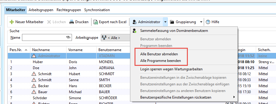 Manchmal ist es nötig, alle Mitarbeiter vom System abzumelden. Wenn Sie mit der rechten Maustaste auf einen Benutzernamen klicken, können Sie diesem eine E-Mail schicken oder den Mitarbeiter aus dem System ausloggen, um z. B. ein neues Update einzuspielen. Bitte beachten Sie, dass diese Funktion nicht in allen Unternehmensnetzwerken zugelassen ist. Es ist allerdings einen Versuch wert.