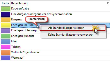Per Rechtsklick auf eine Kategorie können Sie diese als Standard festlegen. Jedesmal, wenn Sie jetzt eine neue Aufgabe anlegen, wird die Kategorie mit dieser Standardkategorie vorbelegt.