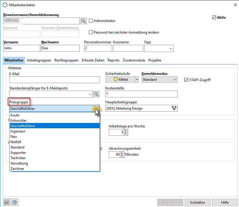 Per Doppelklick auf den entsprechenden Mitarbeiter in der Mitarbeiterverwaltung können Sie dann im Reiter "Mitarbeiter" die Preisgruppe anlegen.