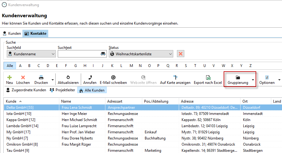 Die Kontaktliste bietet Ihnen verschiedenste Möglichkeiten, Ihre Liste zu gruppieren und zu filtern. So können Sie z.B. eine Liste der Kontakte erstellen, die eine Weihnachtskarte erhalten sollen.