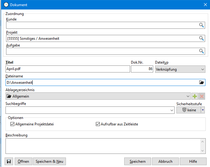 1. Als Verknüpfung speichern (zentrale Ablage): Sie setzen einen Link zu einem bestimmten Dokument. Achten Sie darauf, dass Sie keine Verknüpfungen auf Dateien der lokalen Festplatte anlegen, wenn Sie im Team arbeiten. Sonst haben Ihre Kollegen keinen Zugriff auf das Dokument. Den Pfad zur zentralen Ablage legen Sie in der Konfiguration -> System -> Dokumente fest.