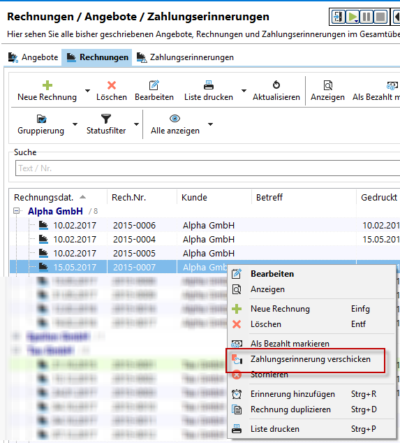 Per Rechtsklick auf eine Rechnung (blau unterlegt) können Sie eine Zahlungserinnerung erzeugen: