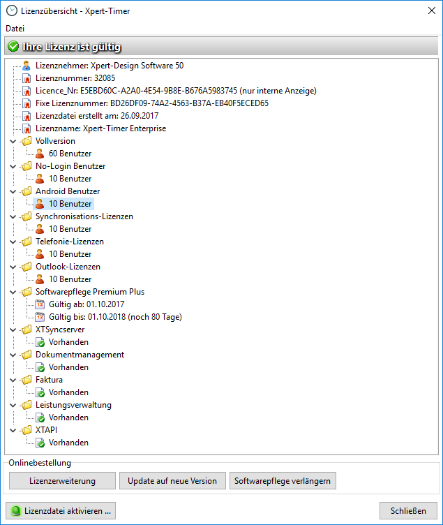 In der Lizenzübersicht sehen Sie, welche Module Ihnen zur Verfügung stehen und wie viele Mitarbeiter für den Xpert-Timer registriert sind. In der Demoversion haben Sie insgesamt 30 Tage Testzeit, 1 oder 10 Benutzer (je nachdem was Sie bei der Installation angegeben haben) und 2 Synchronisationslizenzen. Alle Angaben finden Sie auch im Dialog "Lizenzübersicht".