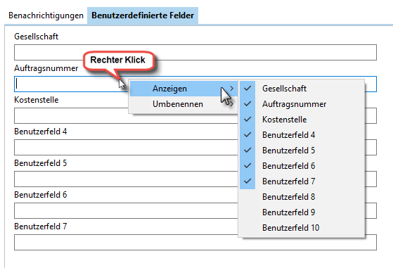 Um die Felder umzubenennen, klicken Sie mit der rechten Maustaste auf ein benutzerdefiniertes Feld oder in den leeren Bereich, falls noch keine Felder vorhanden sind. Im Kontextmenü können Sie jetzt angeben, welche Felder Sie anzeigen möchten und können im selben Menü die Felder auch direkt umbenennen.