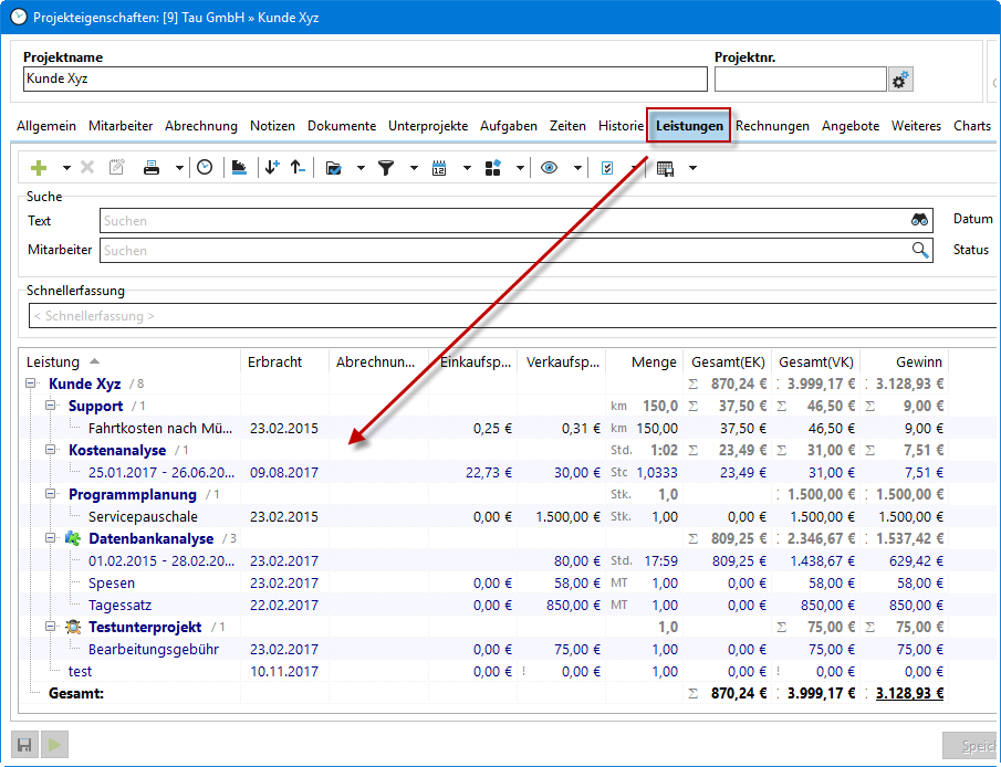In dieser Übersicht unter dem Reiter "Leistungen" können Sie die Projektleistungen zu Ihrem Projekt bearbeiten, gruppieren, filtern und kategorisieren. Weitere Details zur Erfassung von Leistungen finden Sie im Kapitel Leistungserfassung zu Projekten.