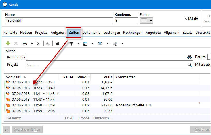 Hier sehen Sie unter dem Reiter "Zeiten" eine Aufstellung der bisherigen Zeitstempel zu Ihrem Projekt oder Kunden. Sie können die Zeitstempel gruppieren, indem Sie den Knopf "Gruppierung" in der Symbolleiste anklicken. Per Rechtsklick auf die Spaltenüberschriften blenden Sie Spalten ein oder aus und können dann die entsprechende Ansicht drucken.