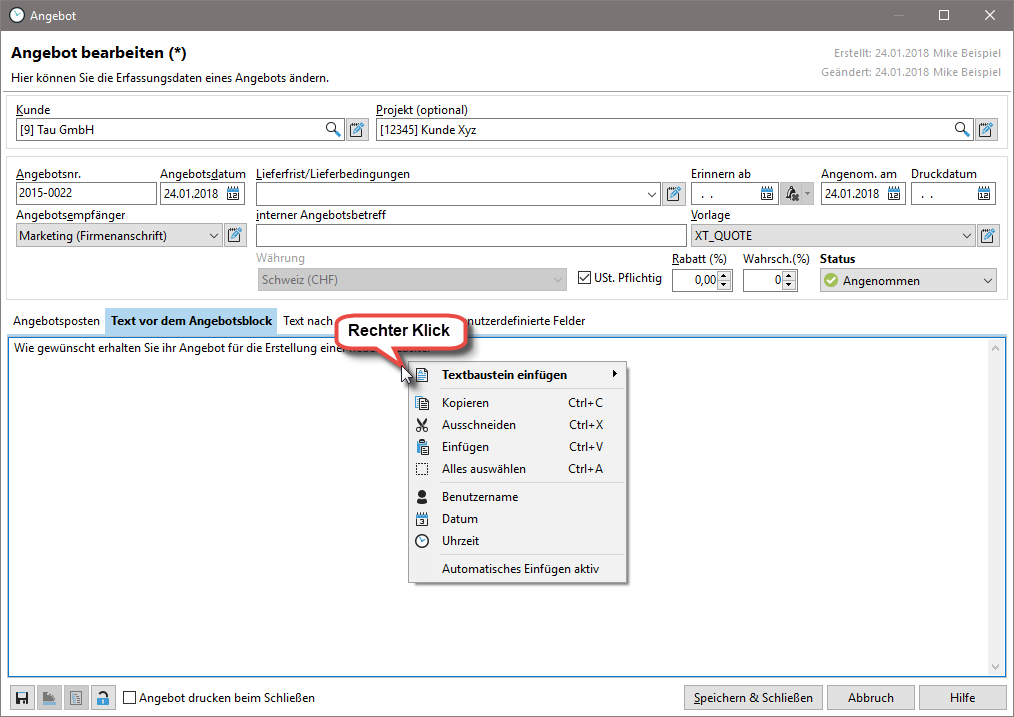 Auf Ihrem Angebot können Sie vor der Auflistung Ihrer Angebotspositionen noch einen freien Text pro Angebot einfügen. Hier können Sie auch von Ihnen definierte Textbausteine nutzen.