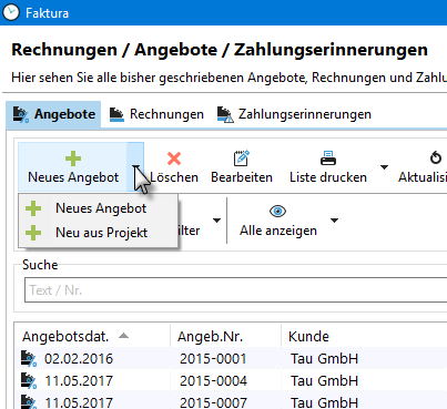 Der Dialog zur Erstellung eines neuen Angebots gleicht dem der Erstellung einer Rechnung. Sie können das Angebot einem Projekt zuordnen oder das Angebot projektunabhängig, aber immer noch kundenbezogen erstellen.