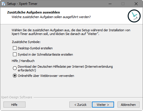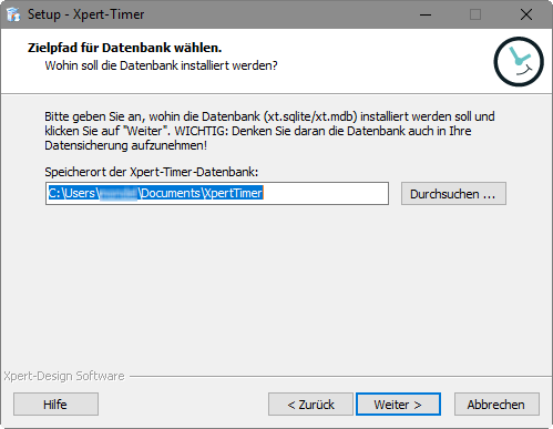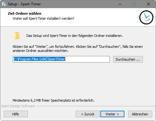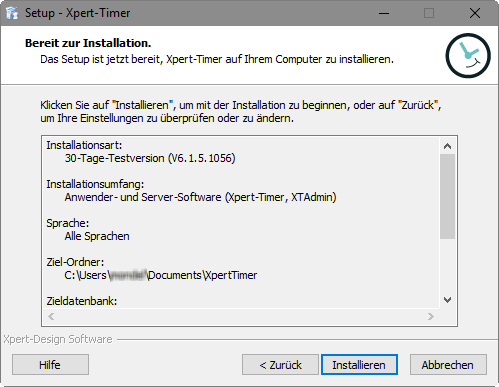 Befindet sich bereits eine Installation in dem angegebenen Pfad behandelt Xpert-Timer das Setup wie ein Update. Ist noch keine Installation vorhanden, wird Ihnen die 30-Tage-Testversion installiert.