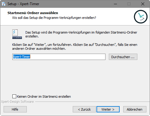 Legen Sie im vorletzten Schritt noch fest, ob Sie in Ihrem Windows-Startmenü eine Verknüpfung zum Xpert-Timer angelegt haben möchten. Dies empfehlen wir, da damit der Start des Programms vereinfacht wird.