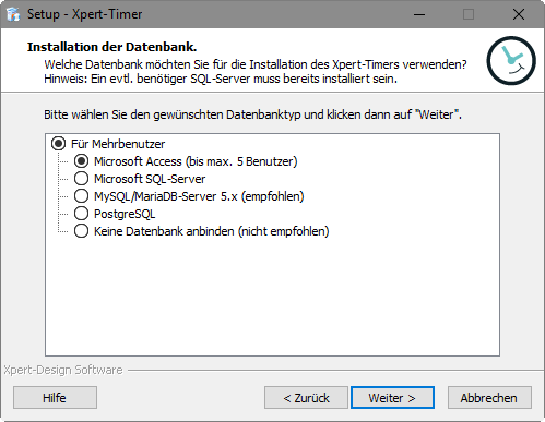Eine MS-Access Datenbank wird auf Ihrem System angelegt, mit der Sie automatisch beim ersten Start des Xpert-Timer verbunden werden. Entscheiden Sie sich später zu einer Mehrbenutzerversion, können Sie die Access Datenbank in eine MySQL Datenbank oder MS-SQL Datenbank umwandeln.