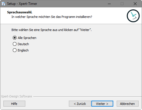 Wählen Sie, in welchen Sprachen Sie den Xpert-Timer installieren möchten. Im Programm steht Ihnen ein Menüpunkt zum Umschalten der Sprachen zur Verfügung.