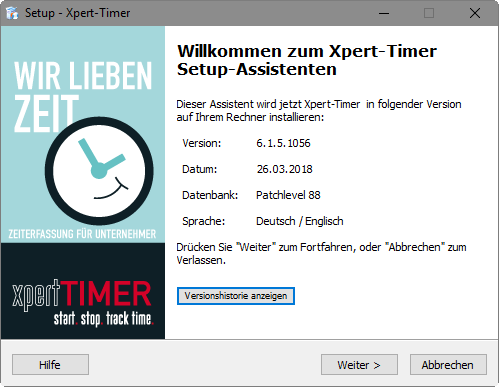Der Installationsassistent startet und zeigt Ihnen die Versionsnummer und das aktuelle Datum an. In der Versionshistorie können Sie nachlesen, welche Änderungen an der Software im Laufe der Zeit vorgenommen wurden.
