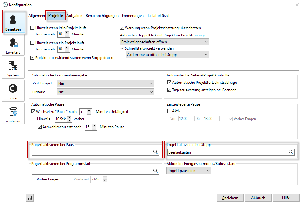 Am besten benennen Sie auch ein Projekt im Projektmanager "Leerlaufzeit", welches Sie unter Konfiguration, Bereich "Benutzer", Reiter "Projekte" als Pausen- und/oder Stoppprojekt anlegen.