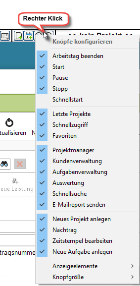 Wenn Sie mit der rechten Maustaste auf die Knöpfe der Zeitleiste klicken, bekommen Sie ein Kontextmenü über das Sie entscheiden können, welche Knöpfe Sie anzeigen möchten und welche nicht.