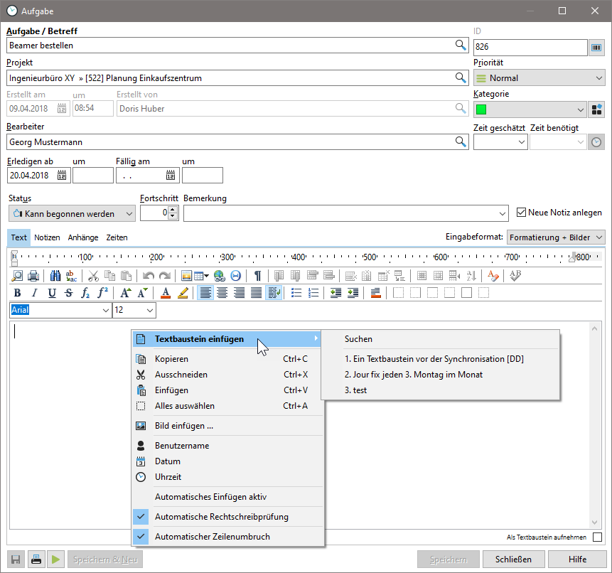 Per Rechtsklick im Textbereich erhalten Sie weitere Optionen und können auch einen Textbaustein einfügen, der vorher in der Konfiguration festgelegt wurde.