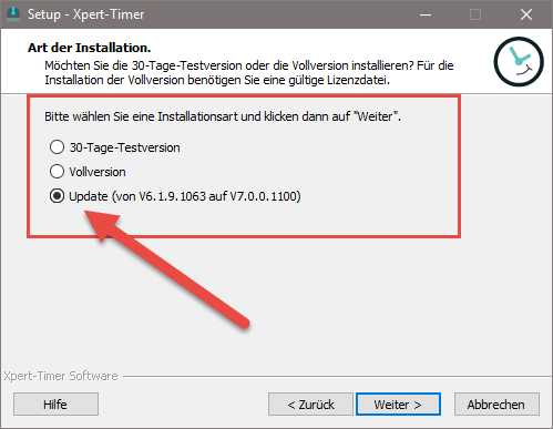 Xpert-Timer muss dabei erkennen, dass es sich um ein Programmupdate handelt. Sie müssen also diesen Dialog sehen: