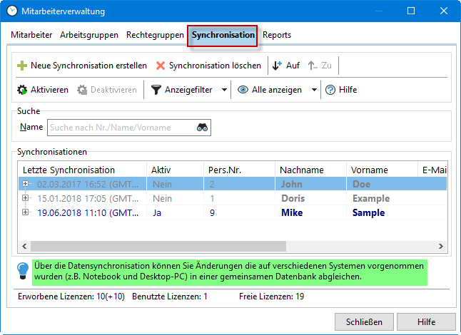 Im Reiter "Synchronisation" in der Mitarbeiterverwaltung können Sie verfolgen, welche Mitarbeiter zu welcher Zeit eine Synchronisation mit Ihrem lokalen System vorgenommen haben.