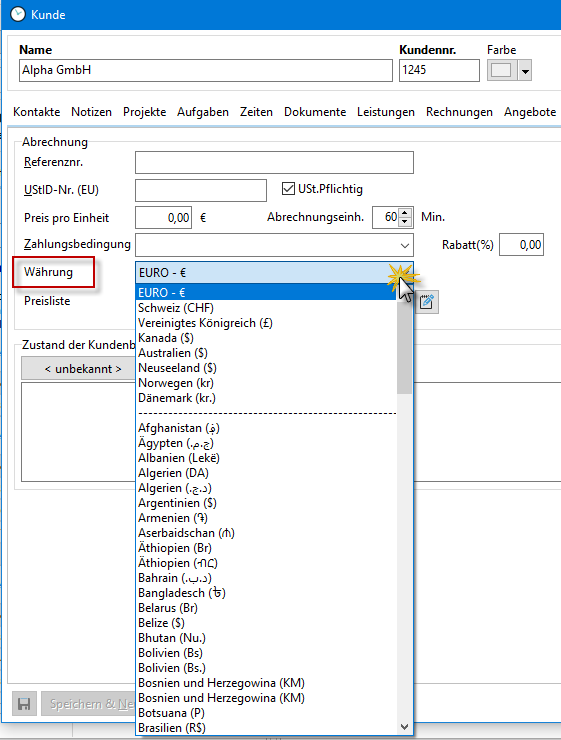 In der Kundenverwaltung können Sie unter dem Reiter "Zusatz" speziellen Kunden eigene Währungen hinterlegen. Damit können Sie jetzt Kunden in deren Währung abrechnen. Auch sämtliche erfasste Zeiten werden dann bei dem Kunden in der entsprechenden Währung angezeigt.