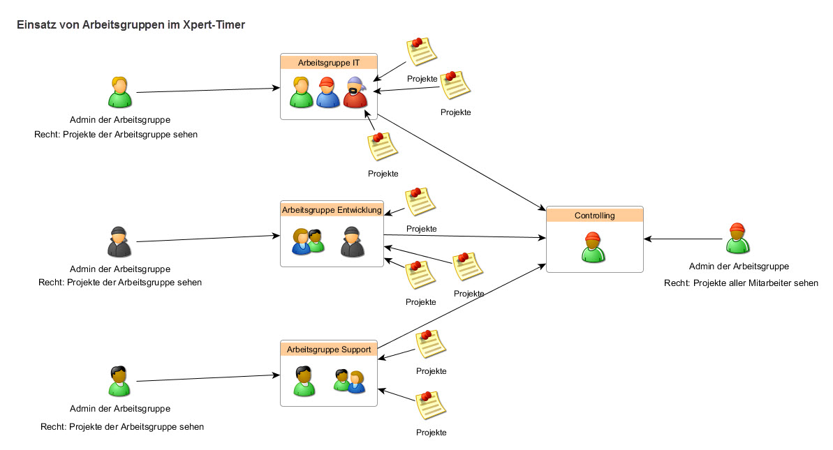 Arbeitsgruppen dienen dazu, Ihre Mitarbeiter in Teams bzw. Abteilungen aufzuteilen. Die Sichtbarkeit der Projekte und auch die Zugriffsrechte können dann pro Arbeitsgruppe individuell gesetzt werden. Jeder Mitarbeiter wird einer (in der strikten Trennung) oder mehreren Arbeitsgruppen zugeordnet. Zusätzlich muss damit auch jedem Projekt eine Arbeitsgruppe zugewiesen werden. Jede Arbeitsgruppe hat einen Verantwortlichen, bzw. Abteilungsleiter, der erhöhte Rechte im Xpert-Timer erhalten sollte, um alle Projekte und erfassten Zeiten seiner Arbeitsgruppe, bzw. Abteilung zu bekommen. Dieser Arbeitsgruppenmodus muss im Administrationsprogramm "XT Admin" aktiviert werden. Erst dann können Mitarbeiter, Projekte und Kunden explizit den Arbeitsgruppen zugeordnet werden. |