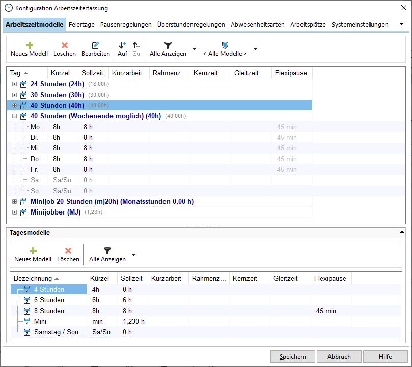 Im Xpert-Timer können Sie beliebig viele Arbeitszeitmodelle anlegen. Sie finden die Übrsicht der Modelle in der Konfiguration der Arbeitszeiterfassung im Reiter "Arbeitszeitmodelle".