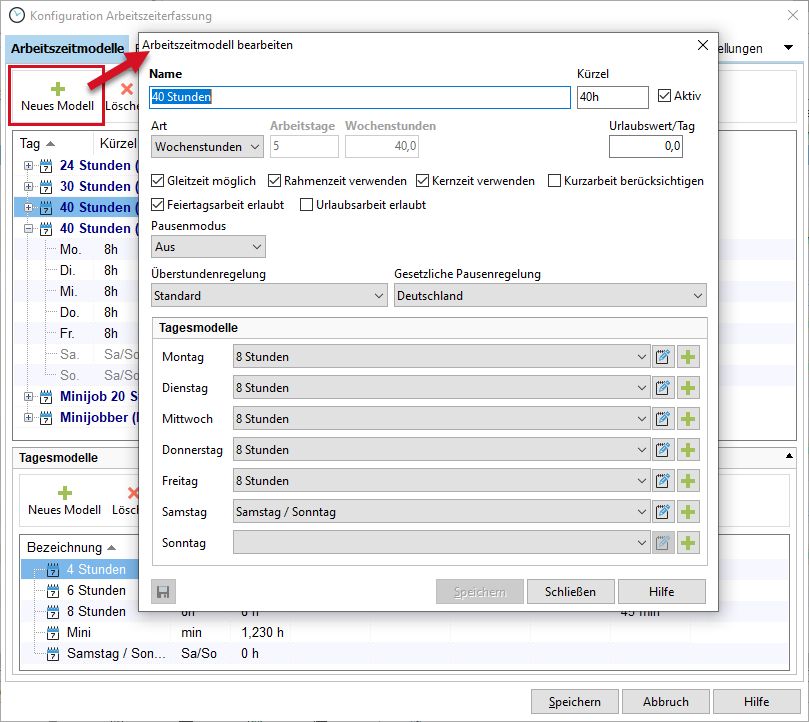 Über den Menüpunkt "Neues Model" legen Sie ein Arbeitszeitmodell an.