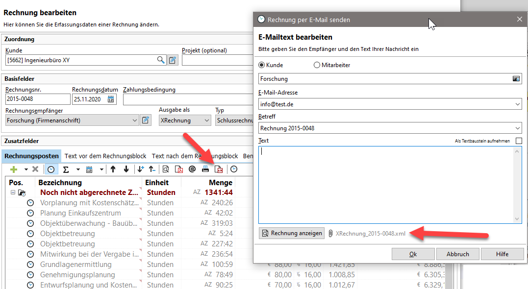 Die XRechnung wird immer als E-Mail mit XML Anhang verschickt. In der E-Mail Vorschau können Sie das Dokument öffnen und anschauen, allerdings ist eine Bearbeitung an der Stelle schwierig, da das XML Format nicht einfach zu lesen ist. Klicken Sie auf OK im E-Mail Dialog, öffnet sich nochmal Ihr Standard-E-Mail Programm zur Bearbeitung.
