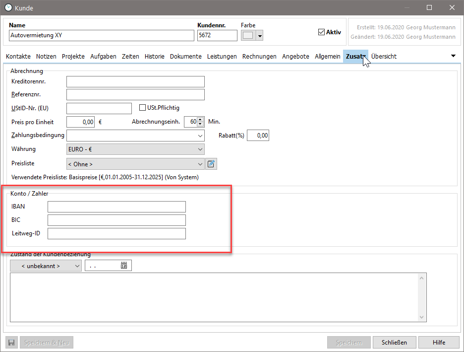 In der XRechnung muss meist eine LeitwegID des Empfängers angegeben werden. Das Feld dazu finden Sie in den Kundendetails. Auch diese Infos erhalten Sie vom Zahlungsempfänger.
