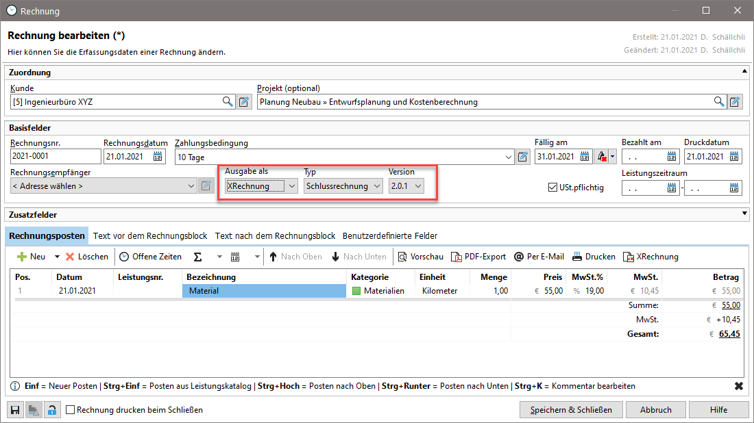 Die XRechnung wird von Behörden in Deutschland gefordert. Die Rechnung besteht dabei aus einem XML Dokument welches genau definierte Felder beinhaltet. Die XRechnung gibt es in der Version 1.2.2. und 2.0.1. In der Rechnungsmaske des Xpert-Timer können Sie Version auswählen.
