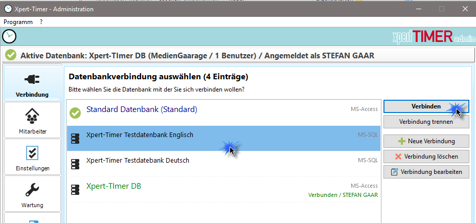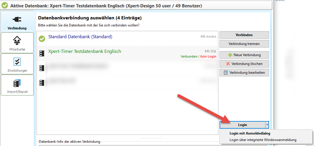Sollte Ihr Login Knopf ausgegraut sein, dann müssen Sie sich erst mit der Datenbank verbinden. Klicken Sie mit der Maus auf die entsprechende Datenbank und wählen Sie "Verbinden".