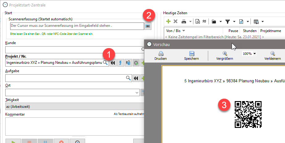 Die Projektstart-Zentrale dient als Basis zur Nutzung von QR-Codes, um Projekte per Barcode-Scanner zu starten und zu stoppen. Benötigt wird ein Scanner, der mit dem PC gekoppelt ist. Der Fokus der Maus muss im der Projektstart-Zentrale sein, damit der Text der vom Scanner gelesen wir erkannt wird.