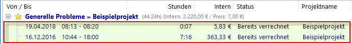 Bereits verrechnete Zeitstempel werden grün hinterlegt und in der Spalte "Status" als "Bereits verrechnet" dargestellt. Diese grün hinterlegten Zeitstempel werden nicht mehr automatisch in die Rechnungsstellung übernommen.