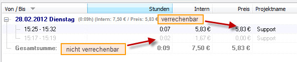 Verrechenbare Zeitstempel werden mit dem internen Preis kalkuliert, gleichzeitig wird aber auch ein externer Preis berechnet. Ein nicht verrechenbarer Zeitstempel wird intern mit dem beim Mitarbeiter hinterlegten Stundensatz berechnet, aber mit einem externen Preis von 0,00 Euro ausgewiesen.